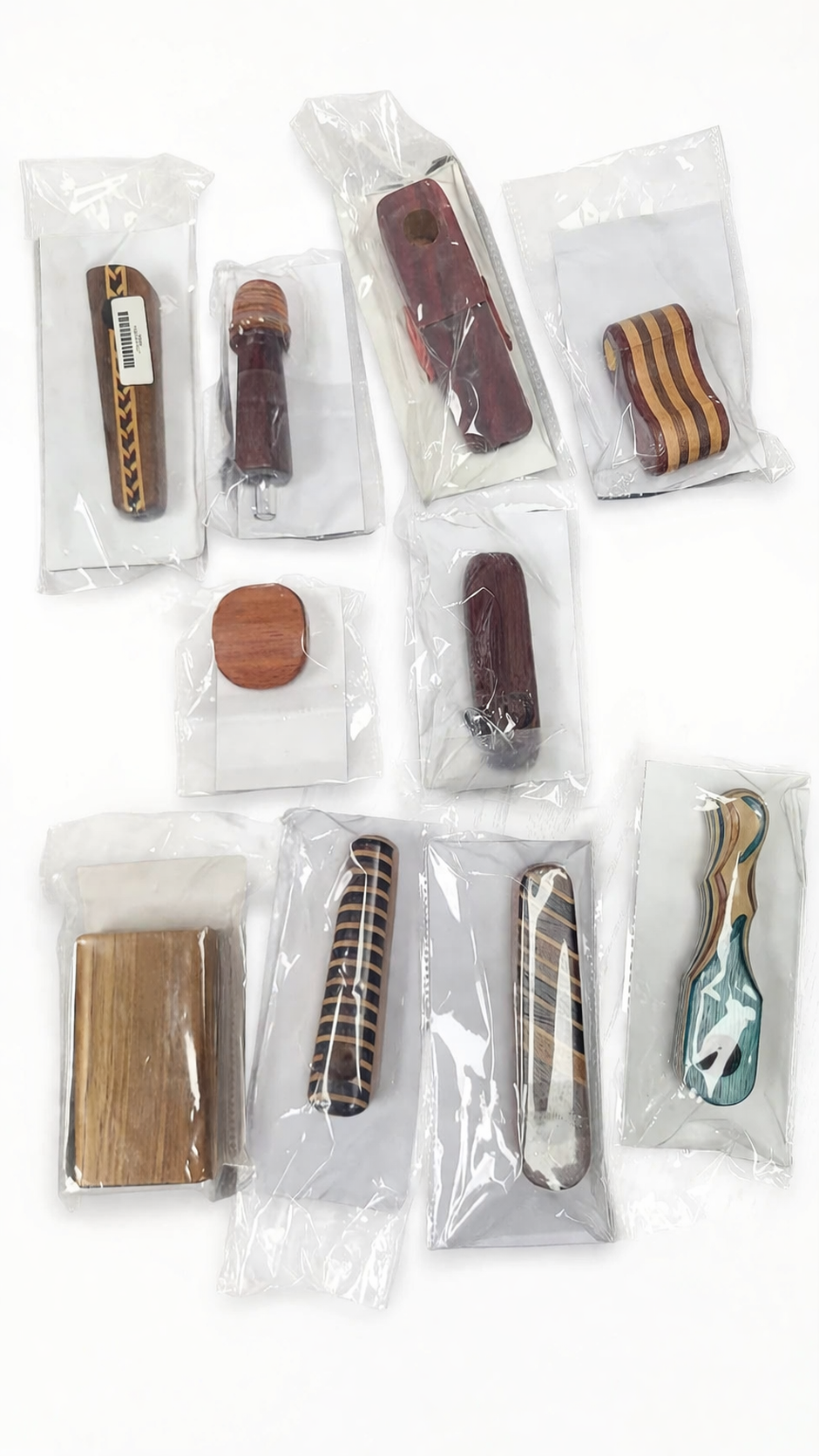Show up and find a 10pk of assorted wood pipes! This bundle packs a variety of wooden pipes for you to lay out on the shelf right out of the bag! Your customer's will be able to choose from all the different styles, from Keychains, to “one-hitters”.