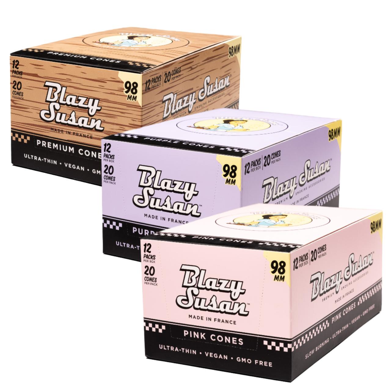 The Blazy Susan - 98mm Cones (12 Packs Per Box / 20 Cones Per Pack) provides a specialized "in-between" size that is highly sought after by enthusiasts. Often called the "Special 98," this size is longer than a standard 1-1/4 but slimmer than a King Size, making it the perfect choice for a longer solo session or a more efficient group smoke.