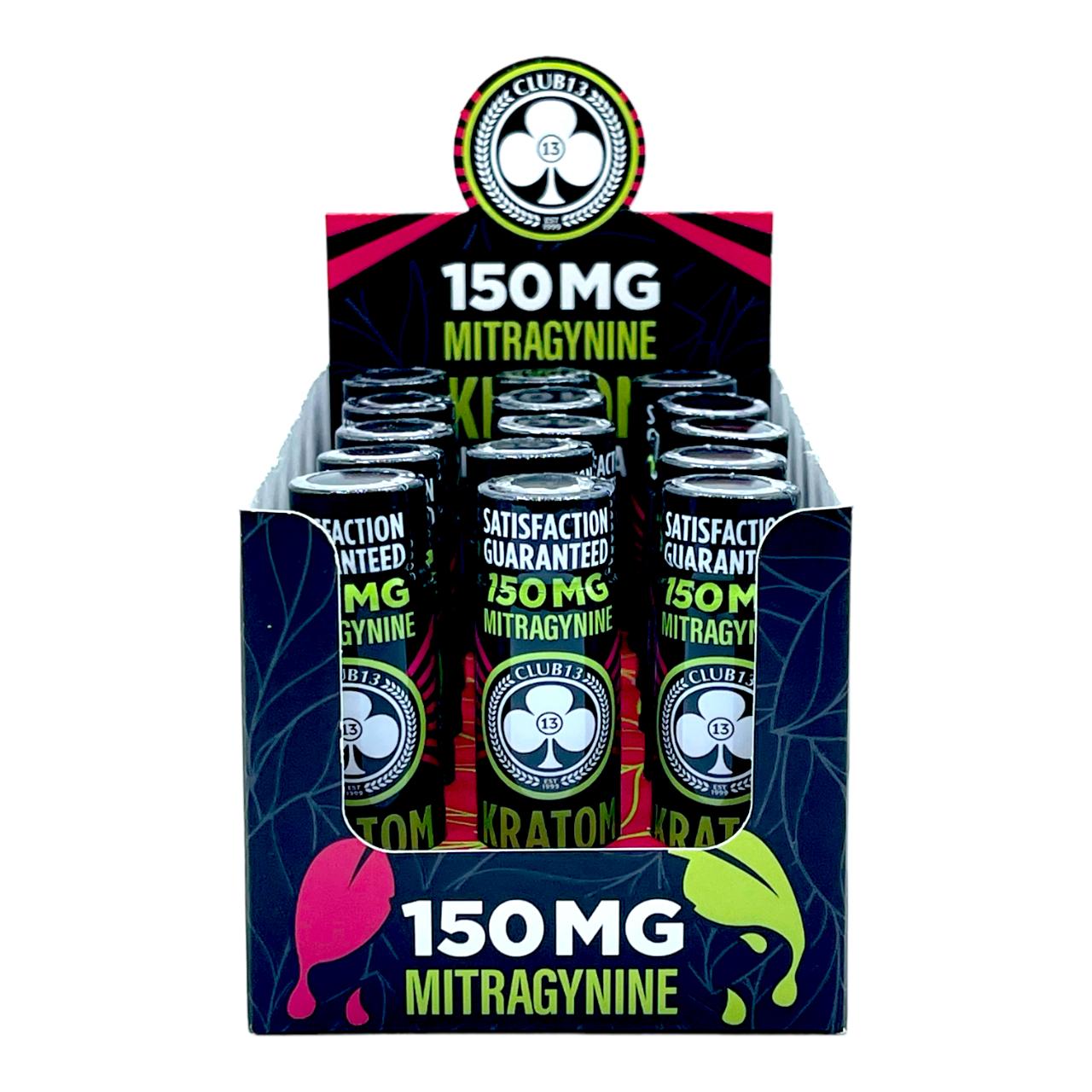 Presenting the Club 13 Kratom Shots 150 MIT-24CT Green Label, which is crafted for users who prefer a ready-to-use liquid format that combines kratom extract with ease and consistency. Each compact 10 mL bottle contains 150 mg of Mitragynine (MIT) — the primary alkaloid naturally found in kratom leaves — suspended in a refreshing lemonade-style base that softens the earthy profile of classic extracts.