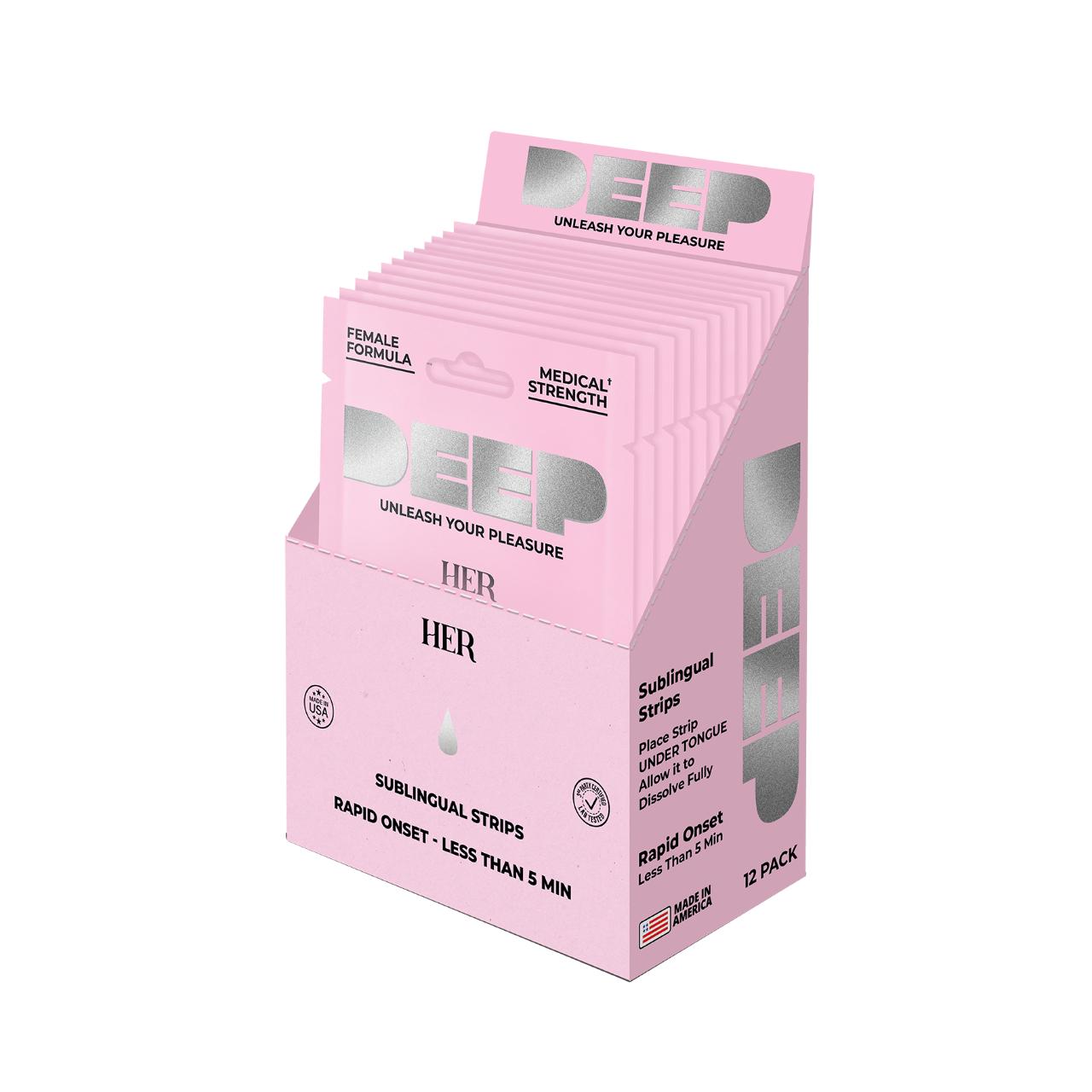 The Deep Strips 12ct Display features oral dissolvable strips designed for rapid absorption and maximum convenience. This delivery method allows the active ingredients to enter the bloodstream directly through the mouth, bypassing the digestive system for a faster onset of effects compared to pills or gummies.