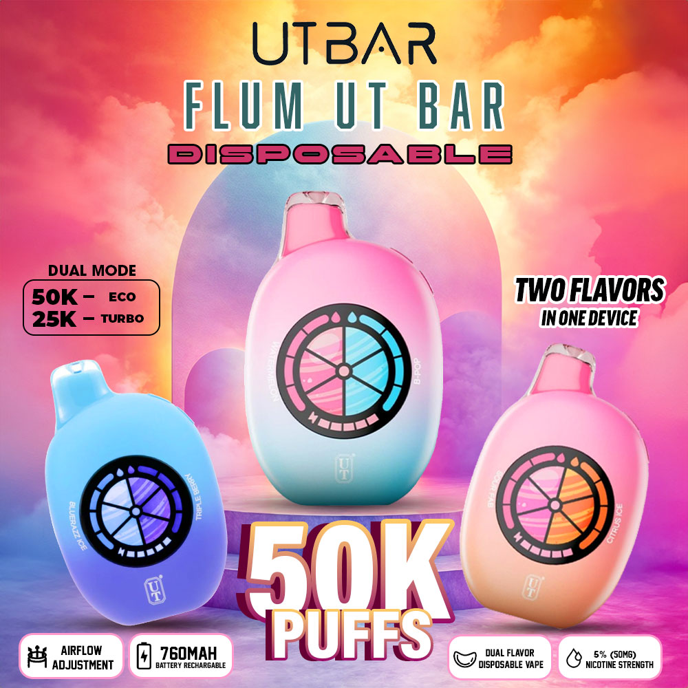 Experience the pinnacle of convenience and customization with the Flum UT Bar Disposable. Engineered for the long haul, this powerhouse disposable delivers an incredible vaping journey with a massive integrated 760mAh rechargeable battery, offering approximately 50,000 Puffs in Eco Mode or 25,000 Puffs in Turbo Mode.