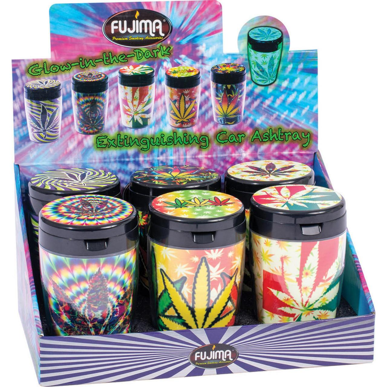The Fujima Extinguishing Car Ashtray (Item #EX32) is a highly functional, safety-oriented accessory designed specifically for use in vehicles. This 6-count display features a specialized "Glow in the Dark" rim, making it easy to locate during night driving.