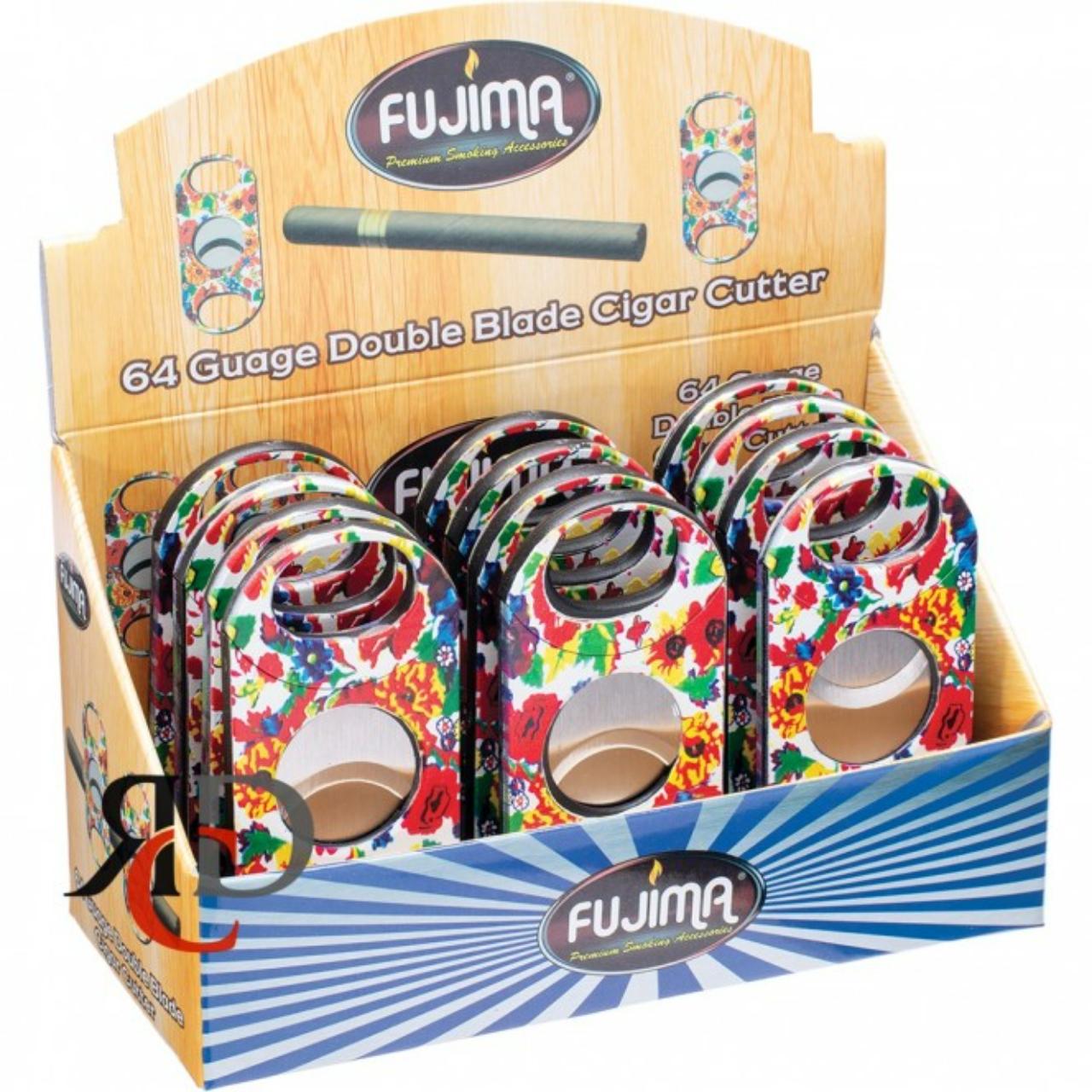 The Fujima Floral Design Double Blade Cigar Cutter (Item #CUT49) is a decorative and highly capable tool designed for larger cigars. This 12-count display stands out for its elegant aesthetic, making it a popular choice for gift sets and high-end retail displays.
