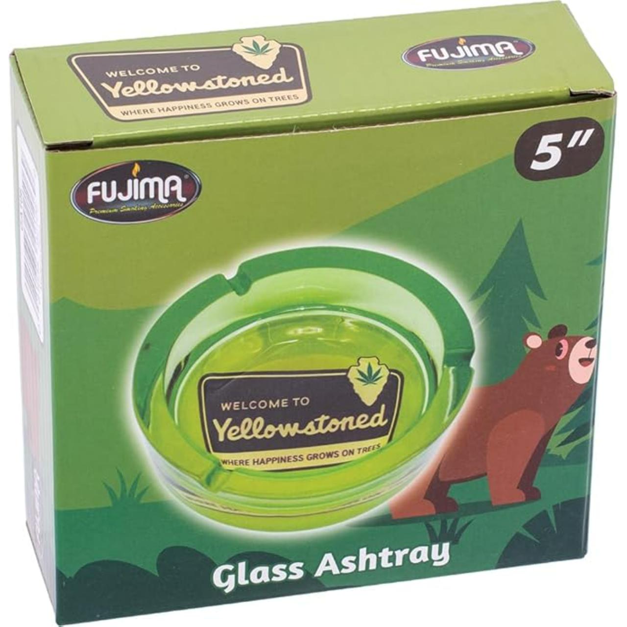 The Fujima "Yellow Stoned" Glass Ashtray (Item #GA106) is a bold, high-contrast piece from Fujima’s graphic glass collection. It features a bright, energetic aesthetic centered around the color yellow, often utilizing pop-art or street-style "stoned" imagery to create a vibrant tabletop accessory.