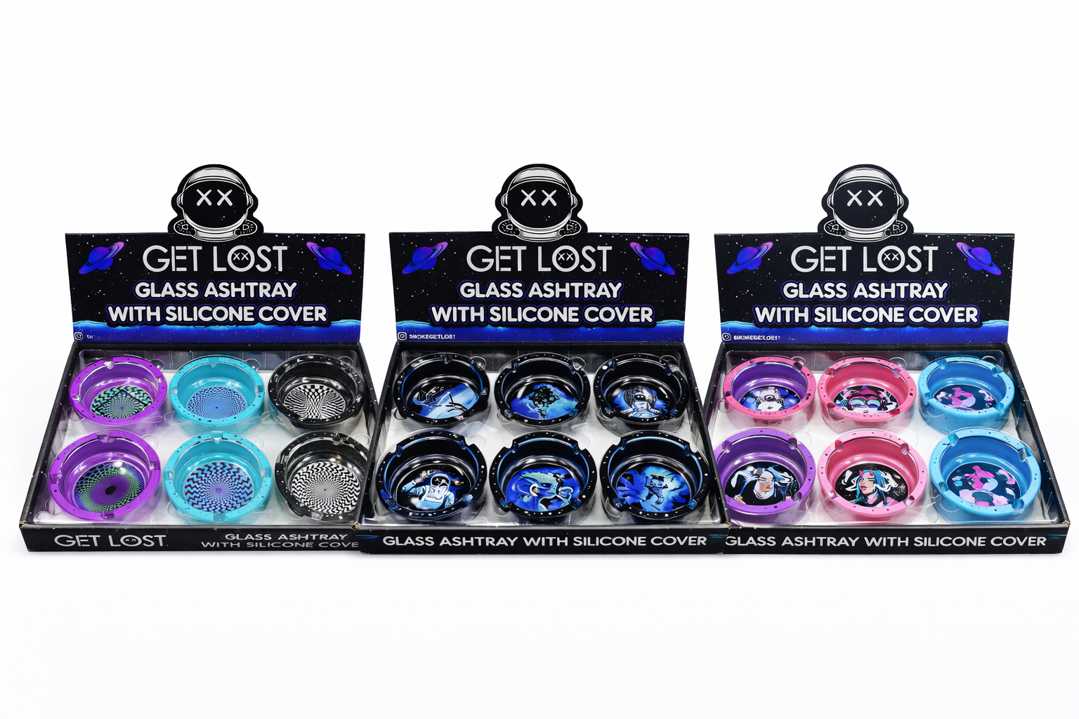 The Get Lost Glass AshTray Silicone-6CT delivers a smart blend of classic glass construction and modern protective design in a wholesale-ready 6-pack display. These high-quality glass ashtrays combine a durable glass bowl with strategic silicone accents or lining that help protect against chips and slips, creating a thoughtful hybrid of form and function your customers will appreciate.