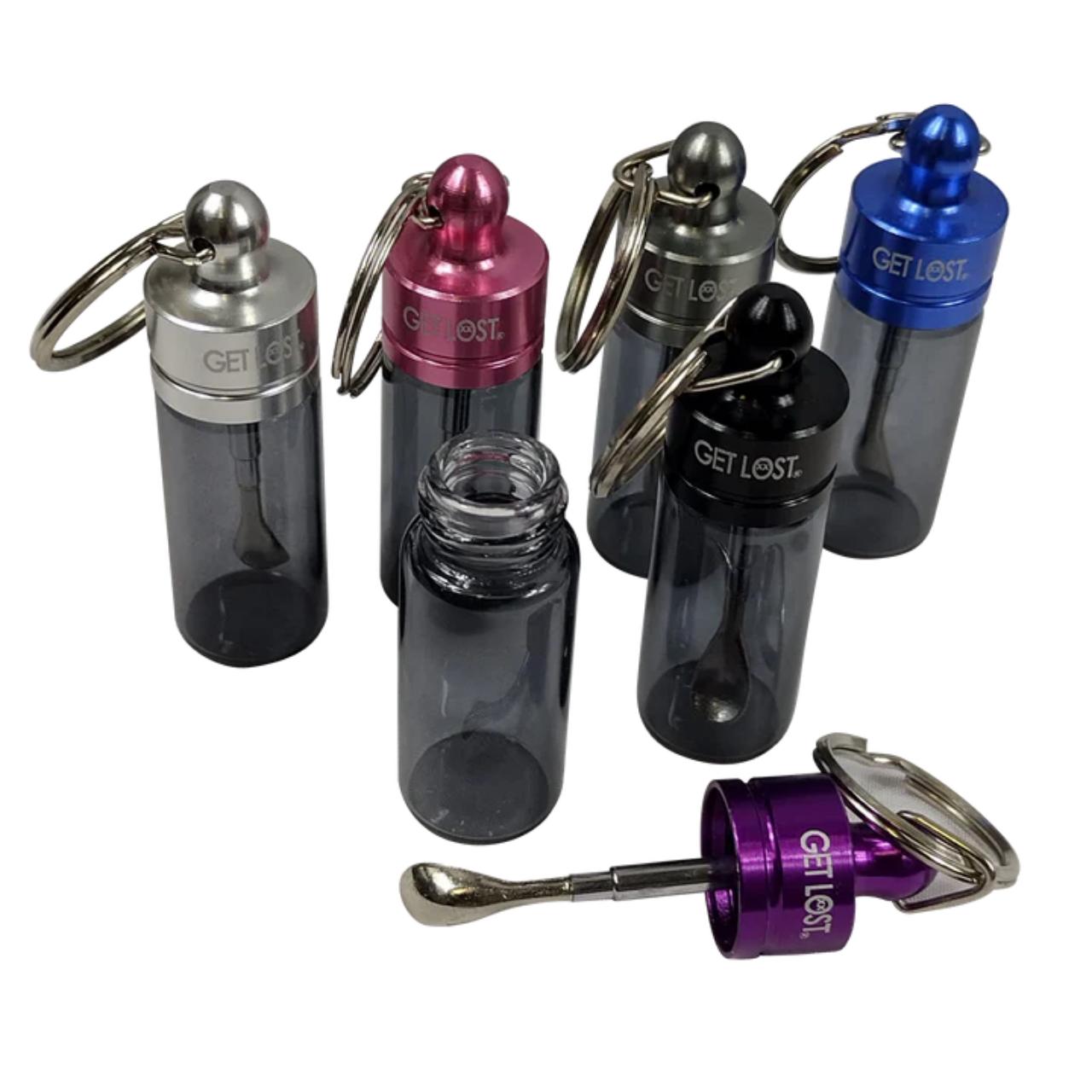 The Get Lost Glass Mini Spoon Container in the 30ct Display is a popular retail-ready set featuring small, portable glass spoon pipes. Each pipe is housed in its own individual protective container, making them ideal for travel and quick sessions.