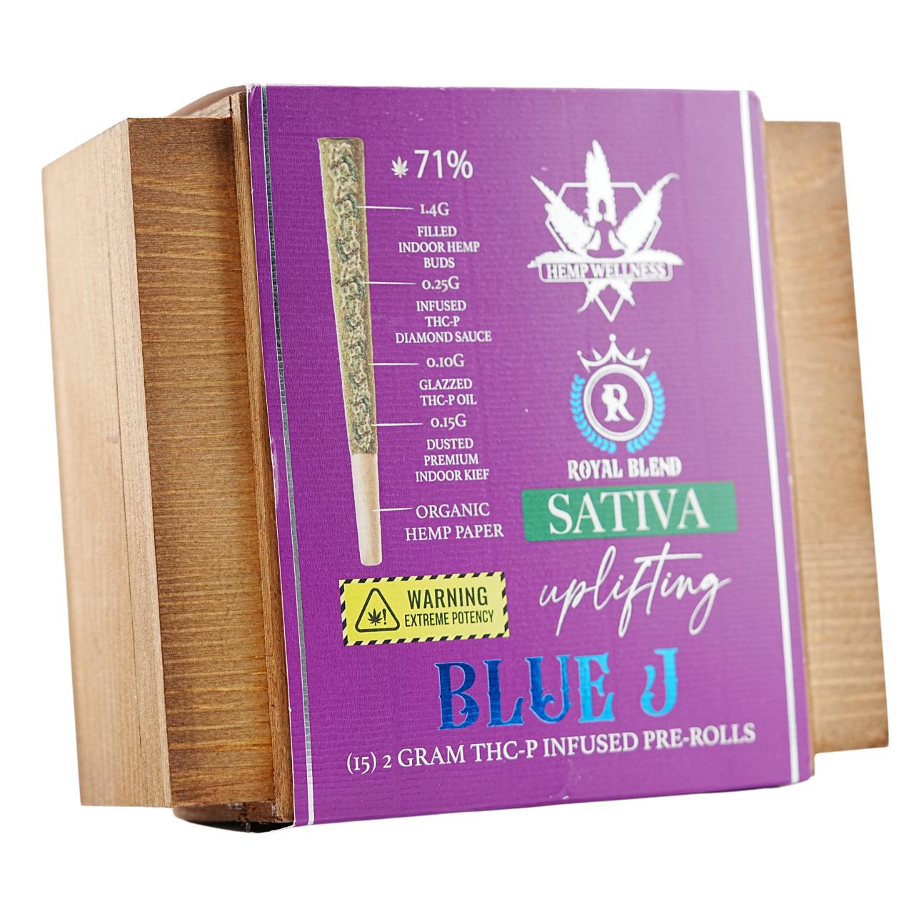 The Hemp Wellness Royal Blend series is a top-tier "Luxury" line, distinguished by its presentation in a custom Wood Box. Each box contains two 2-gram pre-rolls, and the 15-count display provides a total of 30 joints (15 boxes).