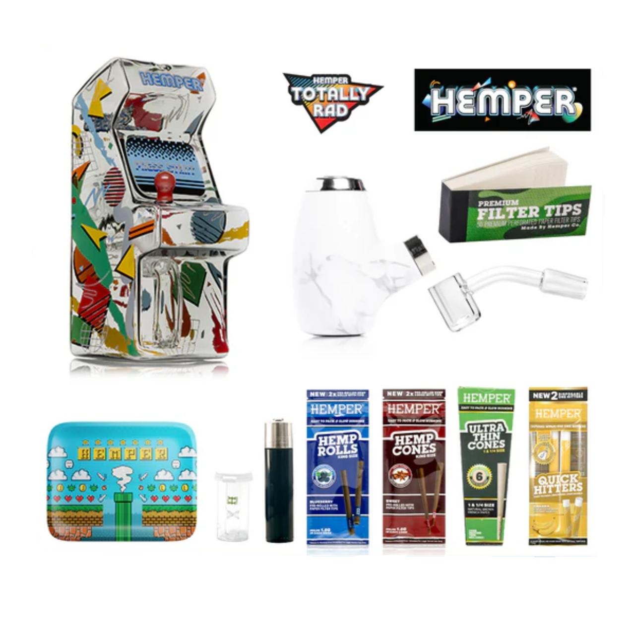 The HEMPER Totally Rad Arcade Water Pipe is the centerpiece of the retro-gaming collection, designed to look like a classic 80s arcade cabinet. This "1 Pack" is a complete kit that includes the water pipe, a custom joystick-themed bowl, and a collector’s box.