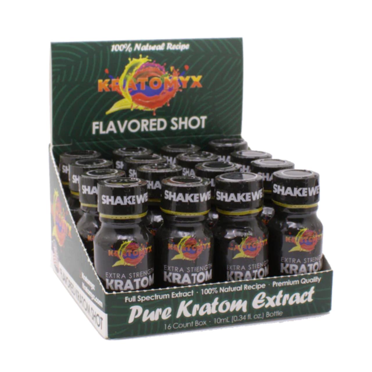 Kratomyx Flavored Kratom Shots (16ct Display) are high-potency liquid extracts designed for users who want the benefits of kratom without the traditional bitter taste. This 16-count retail display is a staple in smoke shops and wellness centers, offering a variety of flavors in a compact, countertop-ready format.