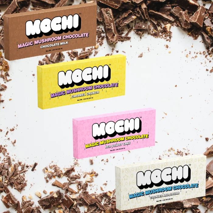 The Mochi Magic Mushroom Chocolate Bars are a gourmet, psilocybin-free psychedelic alternative. This 5-count display contains five individually wrapped chocolate bars, each carefully crafted to mask the earthy notes of mushroom extracts with high-quality confectionery flavors.