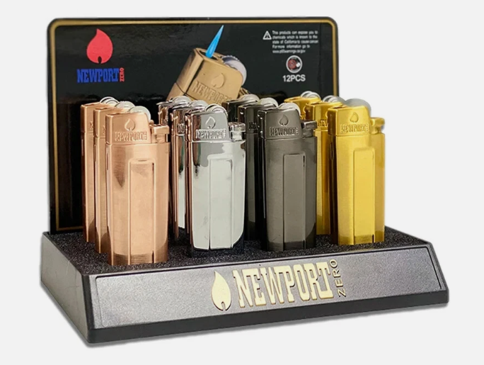 The NEWPORT Jet Flame Lighter (Model NZL117) is a premium, refillable butane torch lighter engineered for performance, durability, and versatility. Designed for both retail merchandising and end-user satisfaction, this item is sold in a 12-lighter countertop display, making it ideal for convenience stores, smoke shops, tobacconists, and specialty retailers seeking a high-velocity torch lighter that combines functionality with an attractive metallic finish and ergonomic profile.