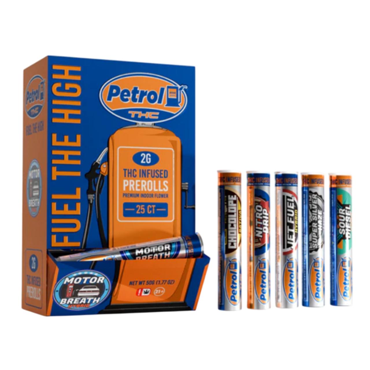 Petrol THC Infused 2g Pre-Rolls in the 25ct Assorted Display are high-potency, "king-sized" pre-rolls designed for experienced users looking for an amplified smoking experience. These are typically "enhanced" joints that combine premium indoor flower with high-purity THC concentrates.