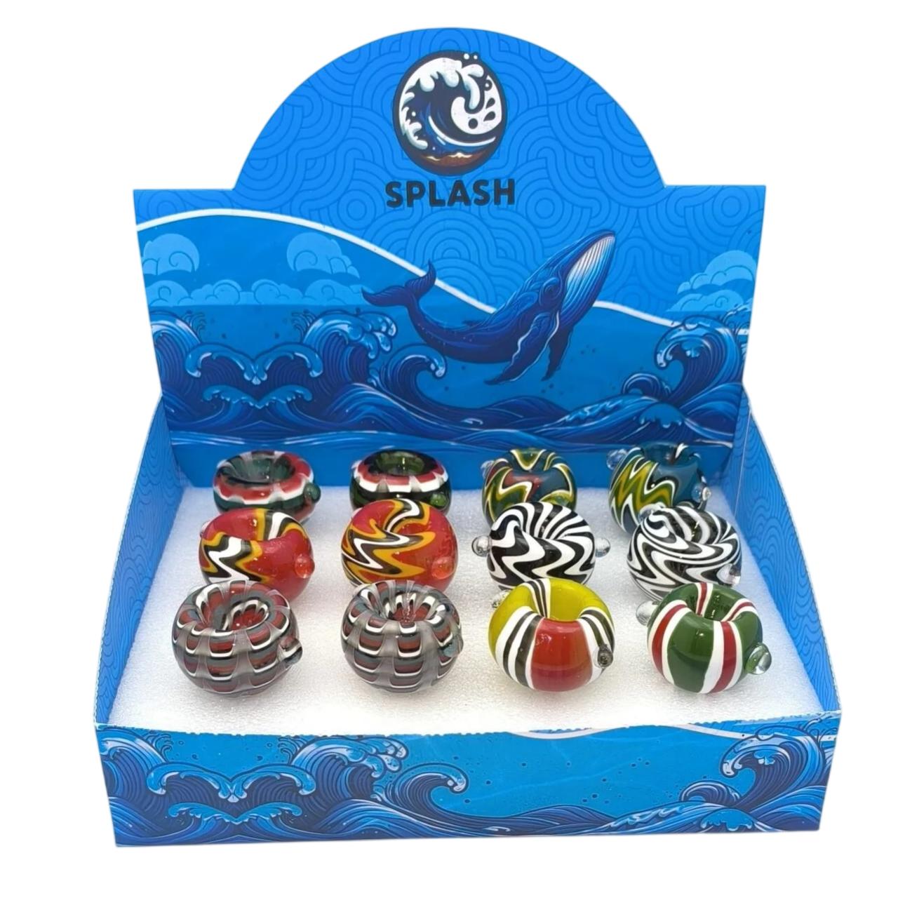 Splash 14mm Bowls (12ct Display) are premium replacement glass slide pieces designed to fit any water pipe with a 14mm female joint. Known for their artistic flair and durable construction, Splash Glass offers a wide variety of styles ranging from classic "martini" shapes to intricate, character-driven, and textured designs.