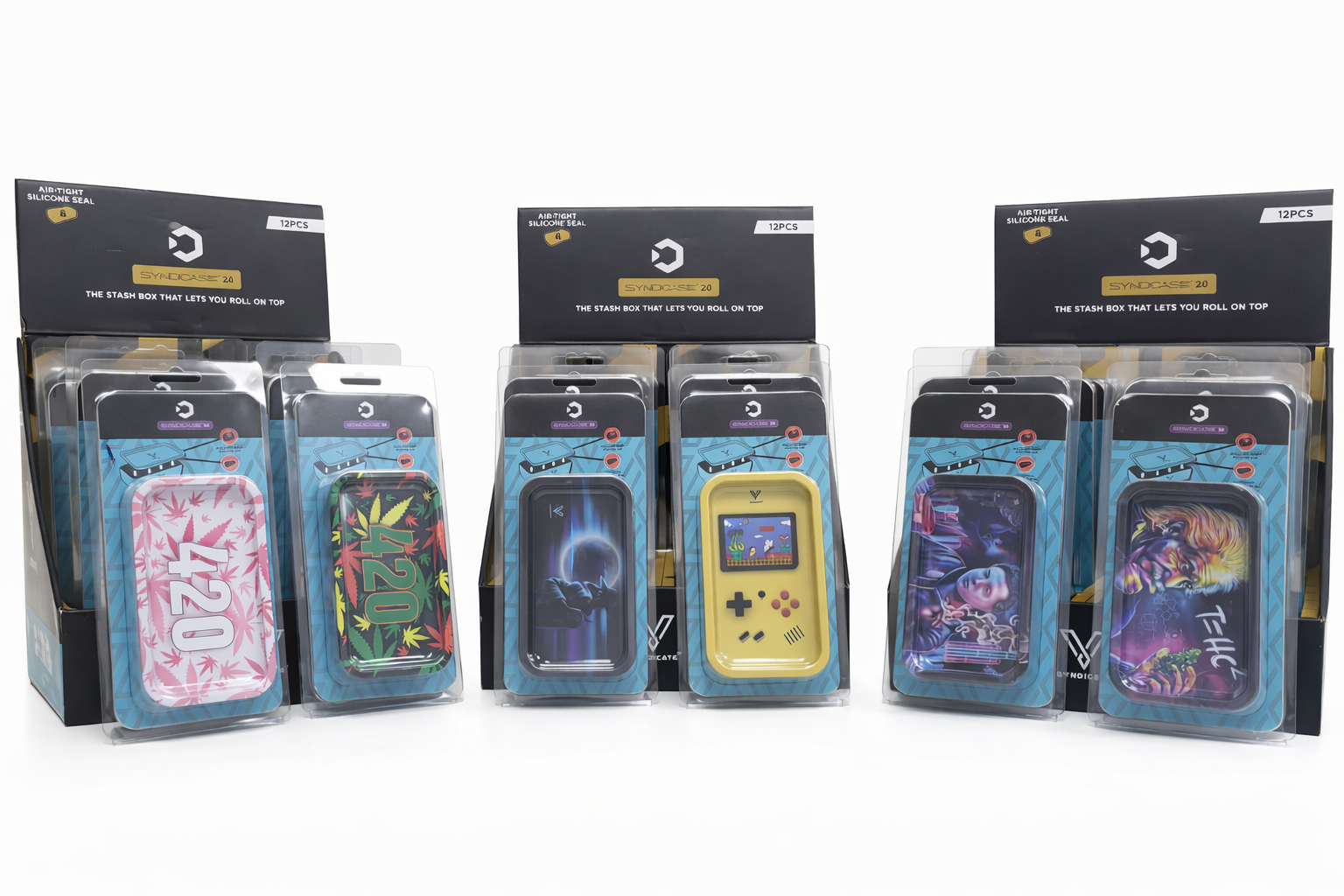 The Syndicate 2.0 Rolling Tray & Stash-12CT is a premium, multi-functional tool designed for maximum portability and organization. Each display contains a 12-count pack, making it an essential bulk item for retailers. Crafted from high-quality, durable tin, this case of premium Rolling Tray & Stash is built to protect your materials from external pressure and impacts. The most notable aspect of this product is the curved top, which serves as a built-in rolling tray for a smooth, ready-to-roll prep surface whenever you need it. Functionality is at the core of the Syndicase 2.0. An airtight silicone seal prevents water from getting in and odors from escaping. Measuring 12.5 cm by 7 cm by 3 cm, it’s compact enough to fit into pockets or bags easily while still accommodating papers, lighters, and up to 14 grams of material. These highly desirable storage containers are distributed by SpeedyDistribution, the best vape wholesaler. With aggressive high-definition artwork and rock-solid functionality, the Syndicate 2.0 is the ultimate all-in-one accessory for today’s vapers. Shop now!