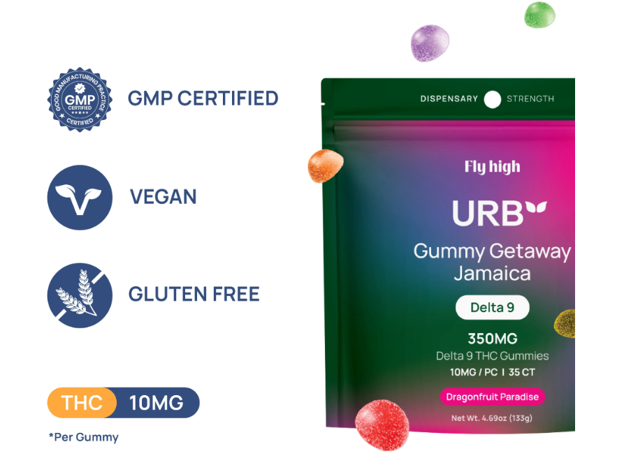 The Urb Gummy Getaway Jamaica series is a "legacy" favorite that focuses on high-quality, hemp-derived Delta 9 THC. This 350mg jar is a mid-strength option, offering a balanced, reliable experience without the heavy botanical or minor cannabinoid blends found in their more complex lines.