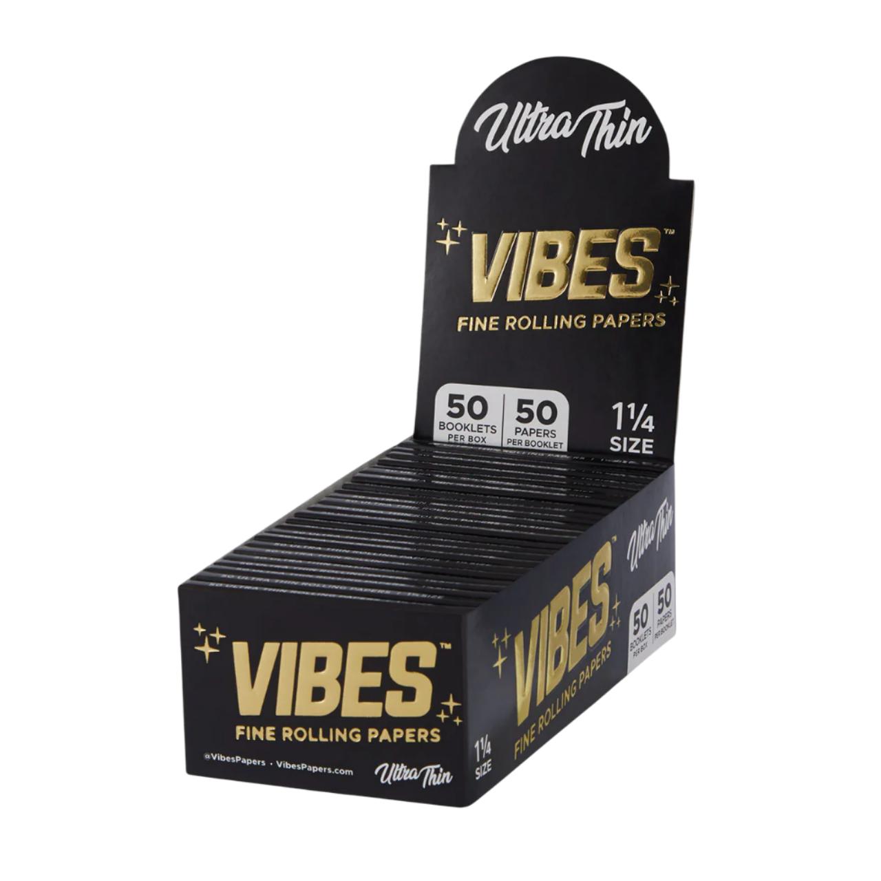 The Vibes 1-1/4 size (78mm) rolling papers in the 50-booklet display box is the standard bulk retail unit, providing a total of 2,500 papers per box. These papers are curated by Berner and produced in France to ensure a premium, even burn.