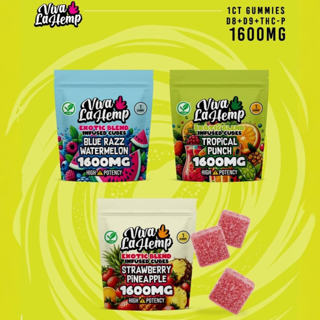 The VIVA LA HEMP Exotic Blend Gummies are designed for high-potency "grab-and-go" retail. This 50-count display contains 50 individual, single-dose pouches. Each pouch contains one massive 1600mg gummy cube infused with a triple-threat blend of Delta-8, HHC, and CBN.