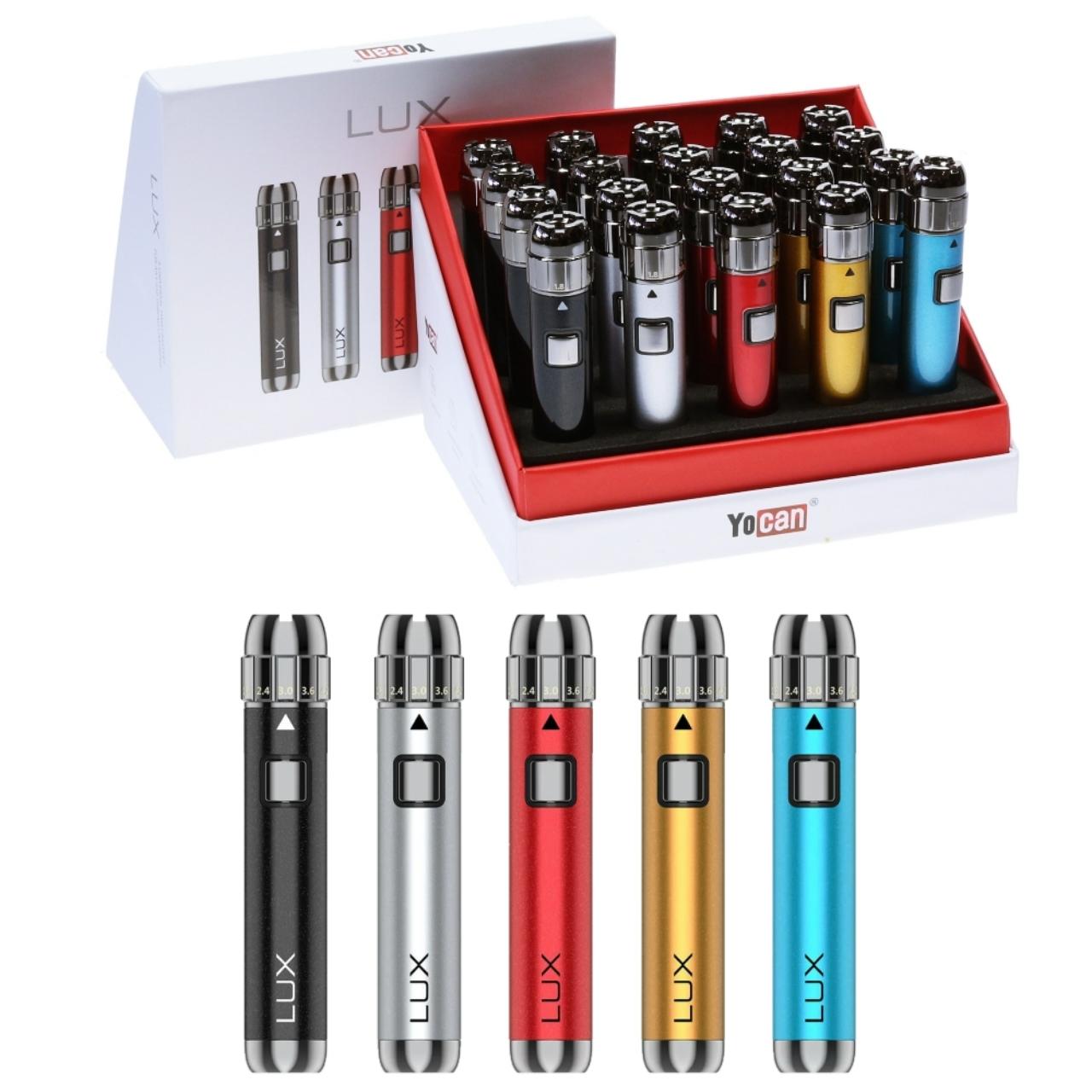The Yocan LUX 20ct Display is a bulk retail package of the classic, high-performance "twist" style 510-thread battery. The LUX is beloved for its traditional pen-style aesthetic combined with a more durable alloy body and a tactile voltage adjustment dial.
