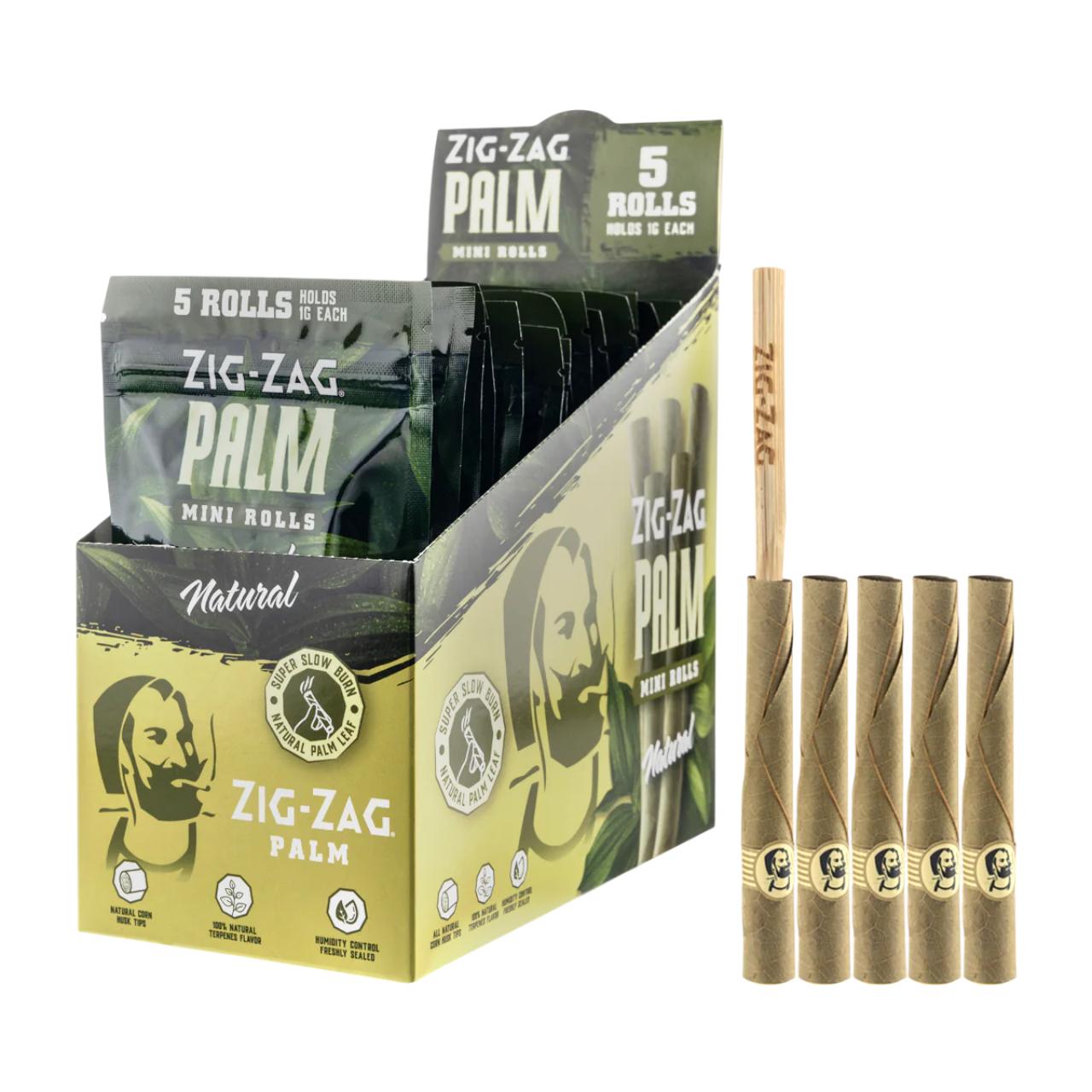 The Zig-Zag Palm Mini Rolls in the 15-pack display box (5 rolls per pack) are a bulk-friendly, tobacco-free option for those who prefer the slow, cool burn of a natural palm leaf. This configuration provides a total of 75 rolls per box (15 pouches x 5 rolls).