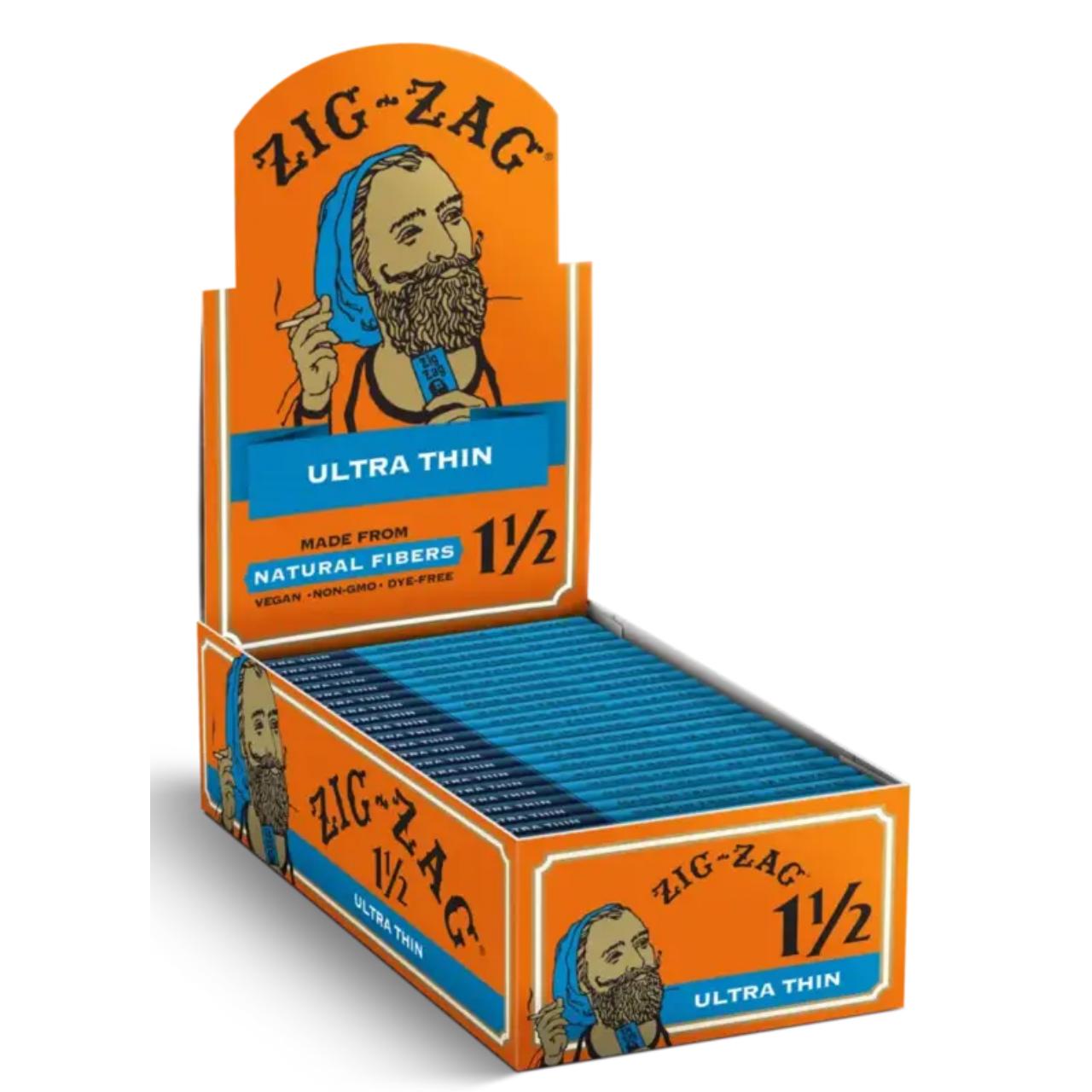 The Zig-Zag Ultra Thin 1-1/2 size (also known as 1.5) in the 24-booklet display box is a specialized format designed for those who want a wider paper for a larger diameter roll, but with the cleanest possible burn. This bulk configuration provides a total of 768 papers per box.